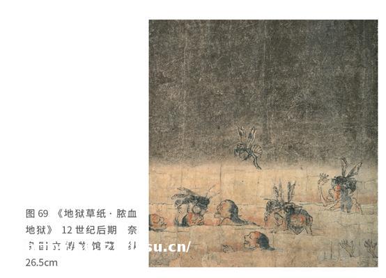 同样的幽默精神在规诫*的宗教绘卷“六道绘”〔六道绘:指反映地狱、饿鬼、畜生、阿修罗、人间、天道各界情景的绘画〕中依然存在,它大胆地揭示了现实的焦虑和丑恶。让我们来看看《地狱草纸》,在亡者坠入的粪池里,巨大的粪蛆长着胡子,睁大眼睛窥觎着,一脸的食人成*的表情。而脓池中长得像是从怪兽漫画中走出来的“最猛大虫”死死地咬住溺亡者,哀叫着的亡者脸部也如同漫画般夸张。不言而喻,这种幽默表现都是有意而为之的。