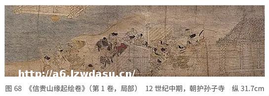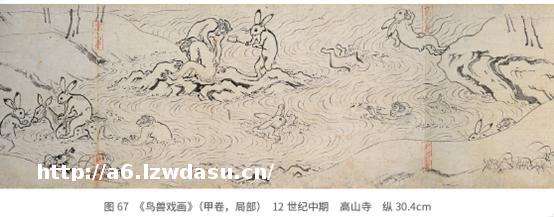 这种戏画的精神和手法,在谢尔曼·李分类为“写实*、讽刺*的故事样式”的绘卷作品中得到了艺术升华,比如12世纪的《鸟兽戏画》《信贵山缘起绘卷》《伴大纳言绘词》等。