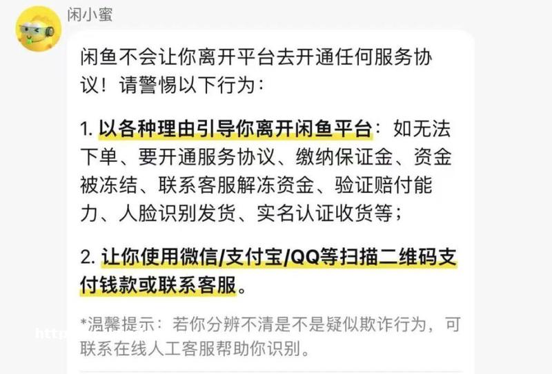 在闲鱼上架一个游戏账号,没过多久就有许多买家前来询问价格,在与买家交流过程中,**框上方有一行提示“引导您脱离闲鱼平台并且联系缴费的都是**行为”的红字,却没有收到任何提示。